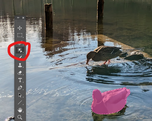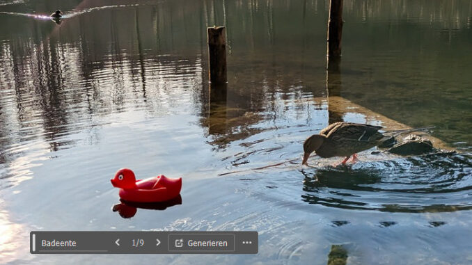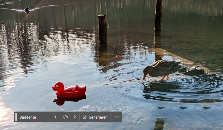 Mit dem neuen Werkzeug Objektauswahl kann ich ein Rechteck mehr oder weniger genau um den Erpel ziehen, und er wird automatisch markiert. Auf diese Art und Weise werde ich sehr schnell den Hintergrund los, um den Erpel beispielsweise in ein neues Foto oder mit transparentem Hintergrund in Word einzusetzen.