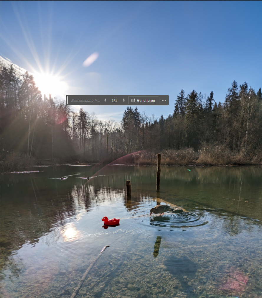 Wir markieren wiederum einen Bereich im Bild mit dem Auswahlrechteck. Es erscheint ein Optionsbalken in der Nähe in dem «Generatives Füllen» steht. Wir klicken in diesen Text und ersetzen ihn durch einen Prompt, was die KI in das Rechteck zeichnen soll. Nach kurzer Wartezeit erhalten wir drei Vorschläge.