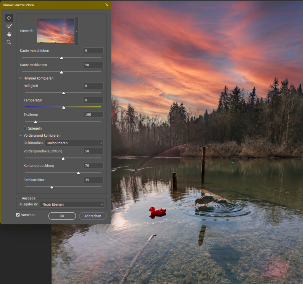 Eine eher ungewöhnliche Funktion findet sich unter Bearbeiten – Himmel austauschen. Es macht genau das. Zuerst müssen einige Himmel heruntergeladen werden, aus denen man dann auswählen kann. Meistens werden die Himmel recht genau erkannt, auch bei Bäumen und unklaren Rändern. Die Funktion beeindruckt mich, weil nicht nur der Himmel ausgetauscht wird, sondern die gesamte Bildbelichtung passend eingestellt wird.