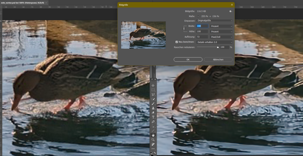 Die Funktion befindet sich unter Bild – Bildgrösse. Nun wählen wir den etwas kryptisch klingenden Modus «Details erhalten 2.0». Rauschen reduzieren können wir bei Fotos eher links lassen. Bei Grafiken sind Werte gegen 100% aber nützlich, um Linien zu glätten und Bildstörungen rauszukriegen.