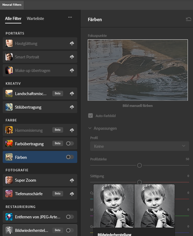Bei Webprogrammen findet man viele KI-Funktionen wie automatisches Entfernen von Bildstörungen oder das Einfärben von Schwarz-Weiss-Fotos. Photoshop bietet dies ebenfalls, allerdings sind auch diese Funktionen etwas versteckt. Wir finden sie unter Filter – Neural Filters.